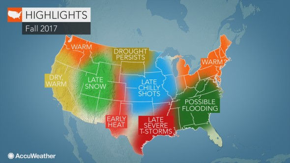 Here is the early look at what may be in store for the U.S. this fall. In the Northeast warm temps may be felt for the majority of the season but there still may some cool shots and snow towards late fall. The Southeast may have to deal will heavy rains and flooding for this fall but at least no drought is in store for the Southeast. Towards the Gulf of Mexico severe weather may occur this fall so if you live around there definitely be watchful and careful this fall. The bad news is that the drought in Montana and North Dakota will persist into this fall and cause even worse drought conditions up there. Then towards the middle of the country snow and cool shots are possible and on the west coast warm and dry conditions will be favored for this fall. Stay updated to this site for all the latest, and more info can be found here on Accuweather.com -- https://www.accuweather.com/en/weather-news/2017-us-fall-forecast-warmth-to-linger-in-northeast-conditions-ripe-for-tornado-outbreaks-from-texas-to-tennessee/70002317