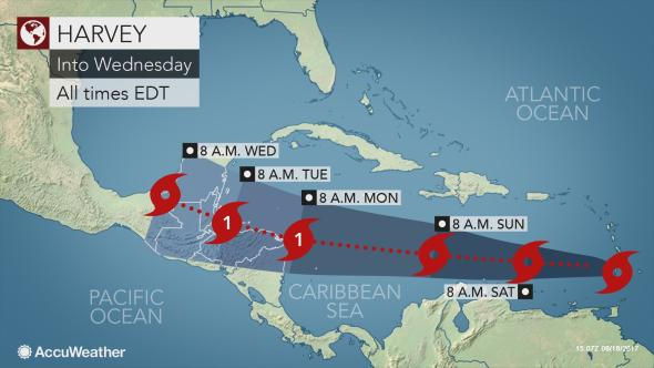 Tropical storm Harvey is headed for Central America and maybe parts of Mexico after drenching the Windward islands with heavy rain. As it draws closer to Central America it may reach a category 1 hurricane but then weaken back to a tropical storm thereafter. More info on this storm can be found right here -- https://www.accuweather.com/en/weather-news/triple-tropical-threat-looms-in-the-atlantic-caribbean/70002485