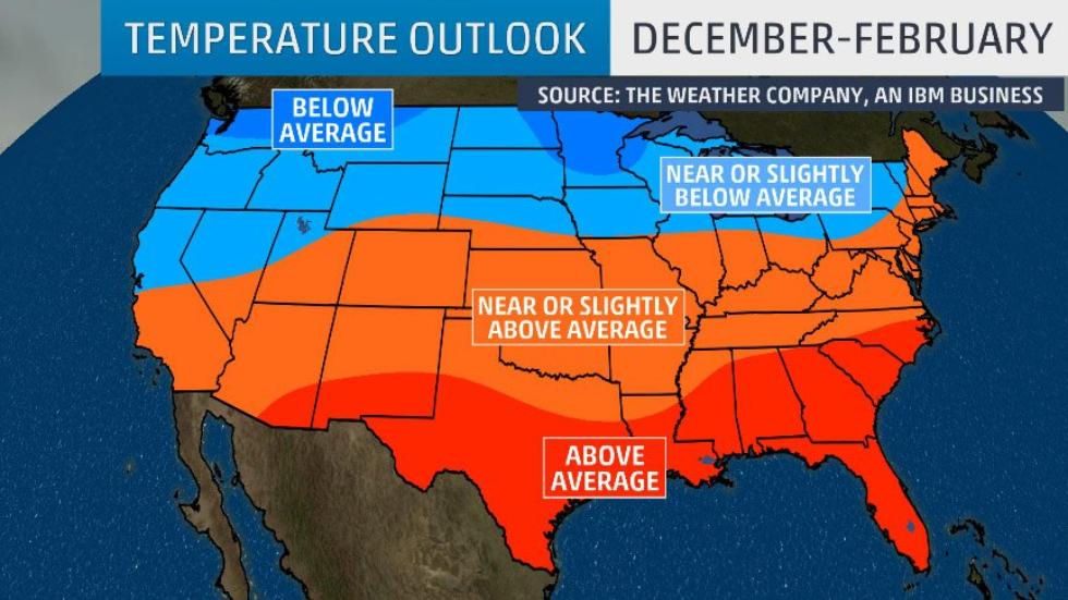 This is the latest weather outlook for this winter in the U.S. Most of the south will have above average temps this winter while most of the north will have below average temperatures. A la Niña is expected to form this winter which is a cool area of water in the Pacific ocean close to South America. La Niña could make the north colder and snowier this winter while it could make the south warmer and drier. Here is more info about this from The Weather Channel - https://weather.com/storms/winter/news/2017-11-06-northwest-harsh-winter-ahead-outlook