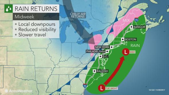 For the Thanksgiving travel forecast it looks like travel weather on Tuesday in the Northeast will be great. However travel weather on Wednesday looks a bit more tough with some coastal rain in New England and some mixing up north. There could also be some lake effect snow in the Great lakes region for Thanksgiving traveling. Here is a link to more holiday travel info from AccuWeather - https://www.accuweather.com/en/weather-news/thanksgiving-travel-forecast-rain-to-hug-us-east-coast-lake-effect-snow-to-slick-roads-near-great-lakes/70003327