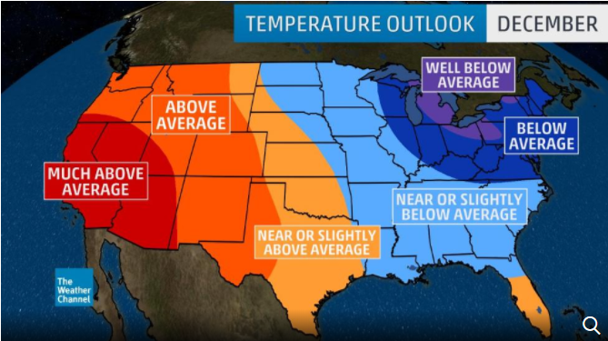 Finally the December weather outlook is in from The Weather Channel. The eastern two thirds of the nation will likely have near to below average temps for this month especially in the Northeast. Out in the West above average temps are looking likely for the month of December especially in the Southwest. Here is more info on this latest weather outlook from TWC - https://weather.com/forecast/national/news/2017-11-29-december-temperature-outlook-the-weather-company-ibm-business