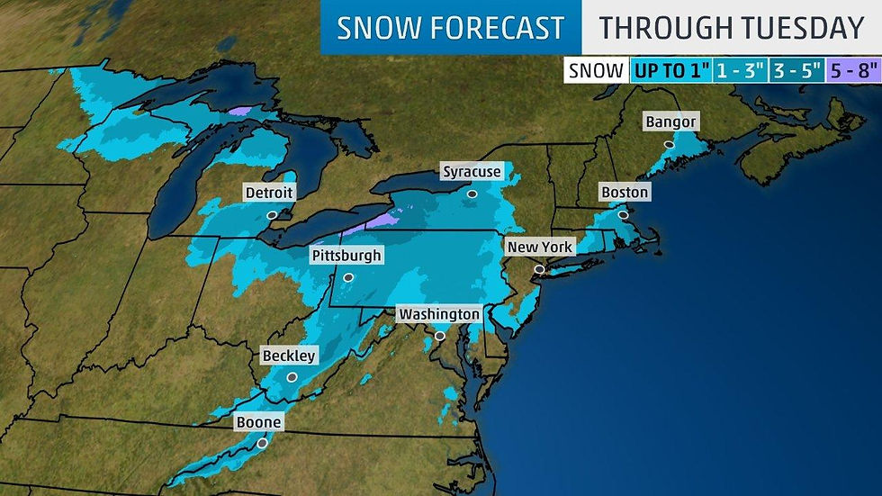 Winter storm Kalani will bring some light snow to parts of the Northeast though Tuesday, but only after bringing heavy snowfall to parts of lower Michigan. Snowfall looks to be heaviest right along the eastern shore of lake Erie where 5-8 inches of snow is possible. Parts of eastern Massachusetts could see up to 5 inches of snow, as well as most of Pennsylvania and parts of western New York. Here is a link for extended information about winter storm Kalani: https://weather.com/storms/winter/news/2018-01-29-winter-storm-kalani-forecast