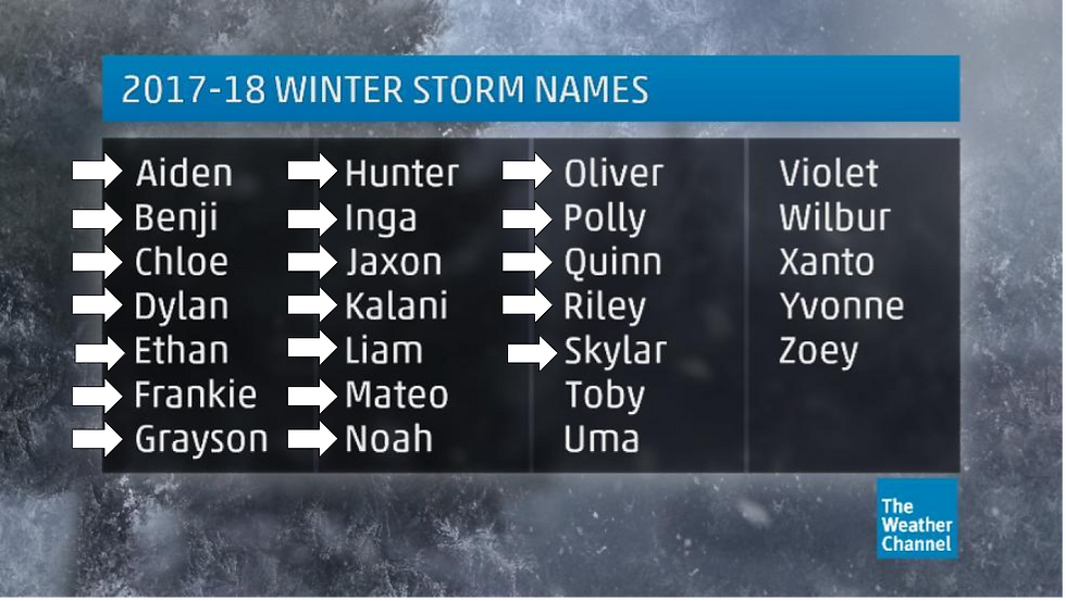 Here are the winter storm names again for this season, and we have knocked off many of these names since the last time you saw this on this website! Since last time, we have had winter storms Noah - Skylar, and Skylar has most recently pounded the Northeast with record snowfall in many places. Stay updated here for what happens with the last 7 names on the list.