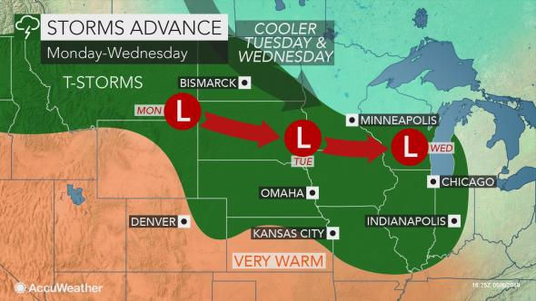 Rounds of rain and storms will advance across Central US this week from Monday on into Wednesday. There will be very warm air off to the South and cooler air off to the North, and that difference in air temp will cause instability and the storms. More info about this can be found here: https://www.accuweather.com/en/weather-news/rounds-of-rain-storms-to-track-across-central-us-this-week/70004868