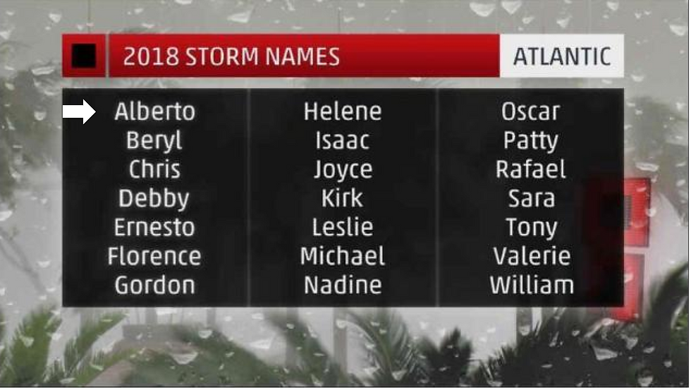 Here is a list of the 2018 tropical storm names for the Atlantic basin. I will be checking off the names as we go along just like I did with the winter storm names. Just so everyone knows, tropical storm Alberto has now formed in the Gulf of Mexico and will likely head towards Florida during this Memorial day weekend. Have a safe and wonderful holiday weekend eveetyone!
