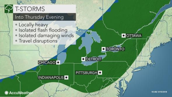Strong to severe thunderstorms will put an end to the heat and humidity in the Midwest and Northeast Thursday into Friday. These storms could lead to flash flooding, damaging winds, and travel disruptions. Here is a link for more info about it: https://www.accuweather.com/en/weather-news/drenching-gusty-storms-to-slice-through-northeastern-midwestern-us-heat/70005402