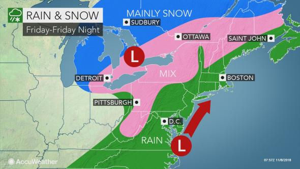 A storm will deliver more heavy rain, wind, and yes, even some snow in the Northeast Friday into Friday night. Along the coastal plain as much as an inch of rain could fall in addition to all the rain they have had there this season. This storm is going to usher in much colder air once it moves out Saturday morning. More info can be found here: https://www.accuweather.com/en/weather-news/northeastern-us-storm-to-deliver-rain-wind-snow-and-usher-in-much-colder-air/70006569